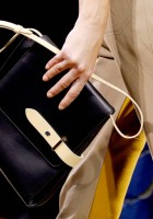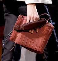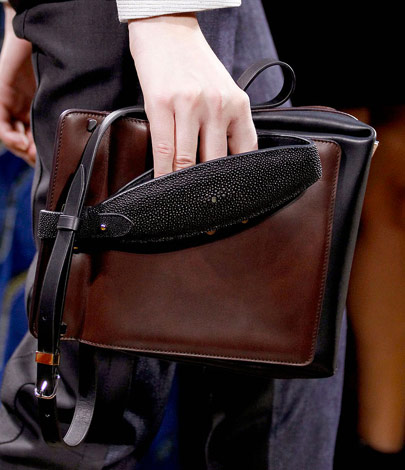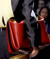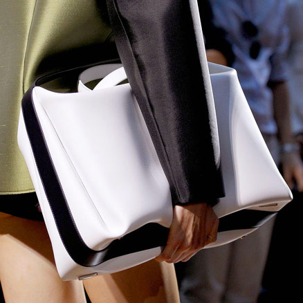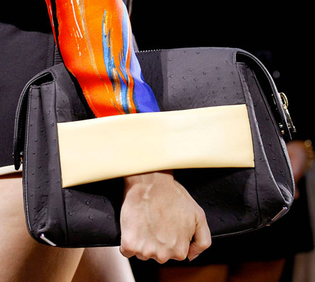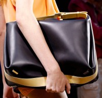 I’d encourage all of you to take a look through the entire Balenciaga Spring 2012 collection because, let’s face it, Ghesquiere is that good, but you’ll get an idea of what was going on just from the bags. Half were ultraminimal two-tone shoulder bags and boxy shapes, and the other half were the kind of smallish bags that we’ve come to expect from the accessories industry in general, but with a very Balenciaga twist. Straps and buckles jut out from spots where you don’t expect, creating a counterintuitive look that still functions as you think such a bag should.