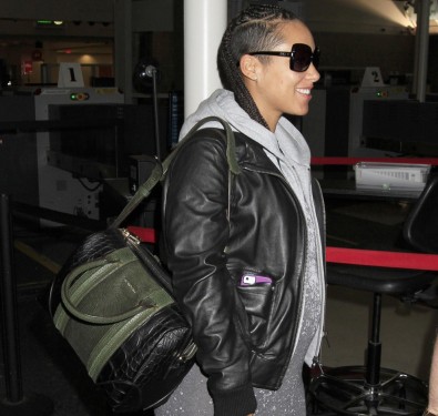 Here’s Alicia Keys, traveling through LAX in a really comfy-looking travel outfit, carrying an intriguing Givenchy Lucrezia Bag that looks to be a combination of black and green suede, regular leather and croc-embossed leather. We couldn’t find this version online, but you can pick up a basic black version of the Lucrezia for $2,000 at farfetch.com.