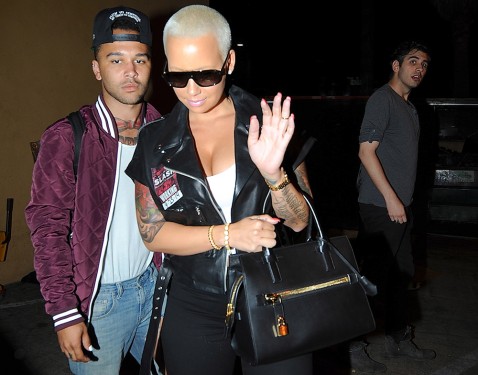 Amber Rose is no stranger to paparazzi cameras, but she’s receiving a little extra unwanted attention this week after announcing her rather sudden divorce from Wiz Khalifa. Here she is ducking out the back entrance of Bossa Nova in LA after dinner with some friends, carrying a gorgeous, polished leather Tom Ford Charlotte Zip Pocket Tote, complete with Tom’s trademark yellow gold hardware. Amber’s exact bag is available for $2,990 at Neiman Marcus.