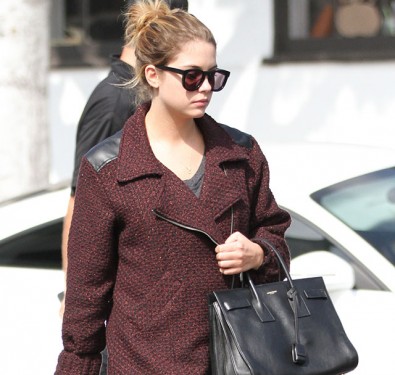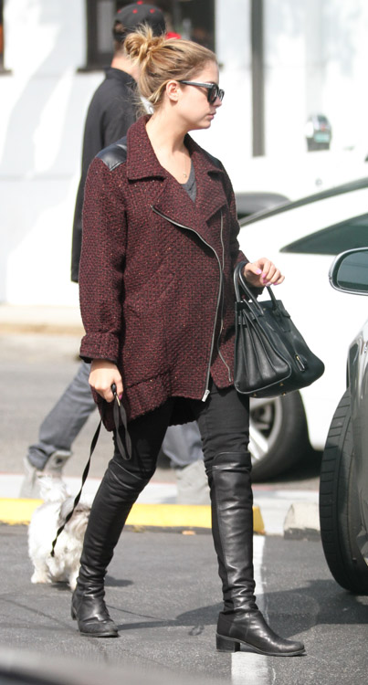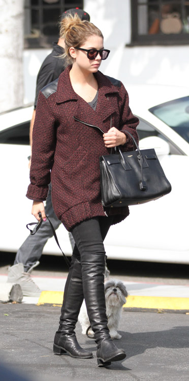 Pretty Little Liars actress Ashley Benson was recently spotted leaving La Conversation Cafe in West Hollywood with an unidentified pooch companion. If her bag is giving you a little deja vu, you’re not alone – that’s the Saint Laurent Sac Du Jour Bag, and yes, it’s very much like a Saint Laurent Birkin. Even so, it’s a very attractive bag, IMO, and wonderfully minimalistic. Also, it’s about $7,000 less than your basic Birkin, which is always a plus. You can pick it up for $2950 at Net-A-Porter.