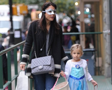 Our celebrity Halloween handbag coverage continues with yet another choice selection from last weekend’s festivities. Here’s Bethenny Frankel, trick-or-treating with daughter Bryn over the weekend in Tribeca. Bethenny is carrying a silver Chanel Classic Flap Bag, which is actually a pretty good hands-free option for trick-or-treating in the ultra-expensive neighborhood environs.