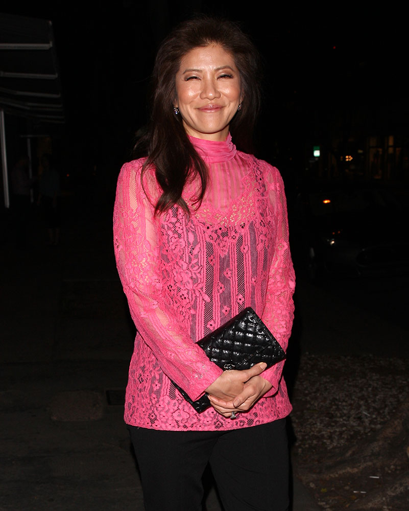 At one of LA’s most paparazzi-friendly restaurants, Madeo, Julie Chen and husband Les Moonves had dinner; Julie carried a Valentino Rockstud Spikes Clutch. Shop the Valentino Rockstud Spikes Clutch via Neiman Marcus ($1,545)