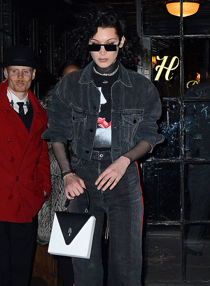Bella Hadid has been carrying this mystery bag around a lot lately. Here she is carrying it during a night out in NYC. Can our readers help us with an ID?