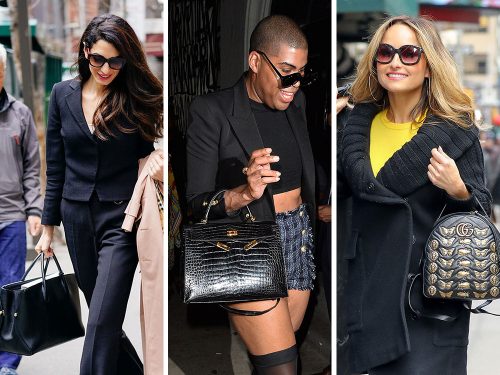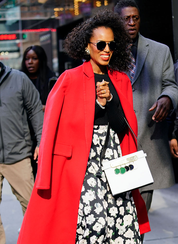 Spring bag trends continue to dabble on the dark side, as celebs (mostly) continue to opt for polished, professional colors and silhouettes, with the occasional gold logos or insects thrown in for good measure. I have not yet seen even a hint of millennial pink, and florals are at an obscene minimum. I have been rushing spring for weeks, now, with no results whatsoever! I can only find solace in wearing every floral-patterned thing I own at the same time, and pondering life’s most inscrutable mysteries. Speaking of which, Kerry Washington has a mystery bag!