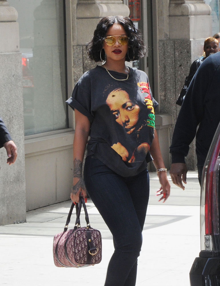 Rihanna is always one step ahead of us. No sooner do we say “Rihanna is doing THIS!” than Rhianna does that. “That,” in this case, is carry a Dior Logo Duffel, which is very similar to her other new favorite Dior, the Dior Saddle Bag. Shop Dior via Vestiaire Collective