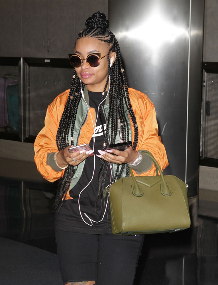 Blac Chyna was spotted at LAX in top Blac Chyna form. She’s carrying a subtle, smaller turtle green Givenchy Antigona Bag. It’s the least subtle thing about this outfit. Shop Givenchy Bags via Neiman Marcus