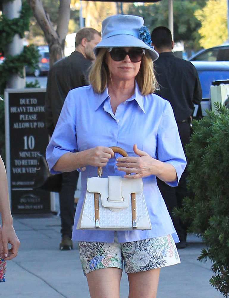 Here’s Emmy Rossum, waiting for her car outside of celeb lunch hotspot Il Pastaio in Beverly Hills. She’s carrying a black suede Salvatore Ferragamo shoulder bag, which may be so new it’s yet to come out—we can’t find its name. Shop Ferragamo Bags via Neiman Marcus
