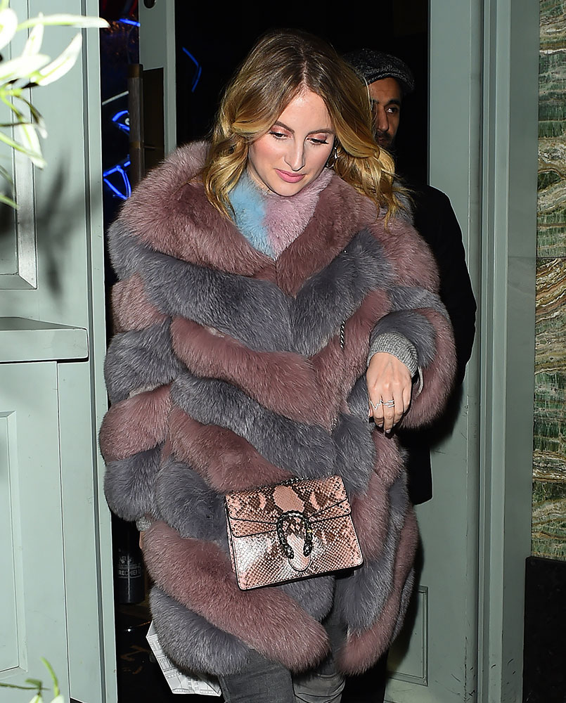 Rich Brit/blogger Rosie Fortescue was recently spotted leaving Sexy Fish in Mayfair wearing a coat that Pam Anderson would not approve of, and carrying an exotic Gucci Python Dionysus Bag. Shop the Gucci Dionysus Bag via Gucci ($3,980)
