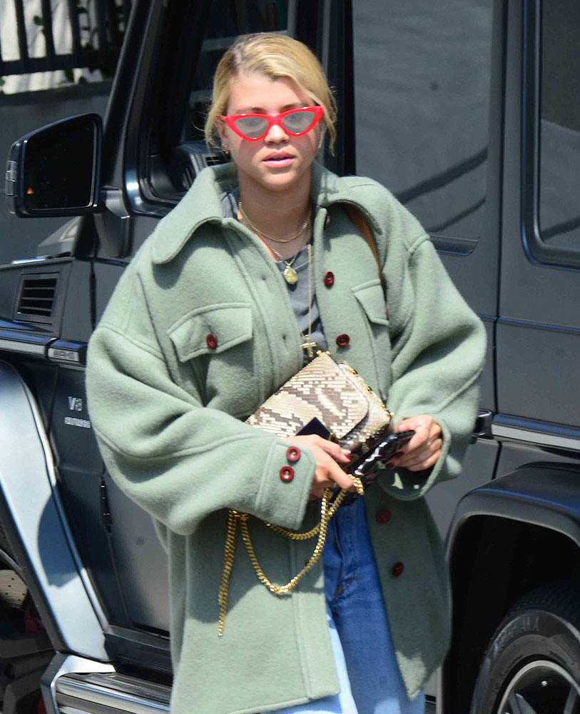 Finally, we have Sofia Richie, heading to lunch at La Conversation in West Hollywood with an exotic Jimmy Choo Lockett Bag. It can’t possibly be that cold in West Hollywood yet, Sofia. Shop the Jimmy Choo Python Lockett Bag via Jimmy Choo ($2,695)