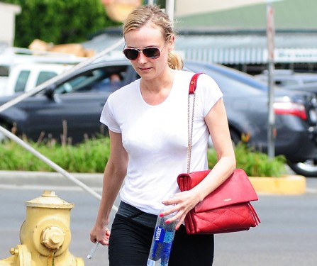 Here’s Diane Kruger leaving the gym in West Hollywood. She’s the first celeb that we’ve seen carrying the new Lanvin Sugar Bag, which is brand new for Fall 2014 and a big push for a brand that’s hasn’t really done exceptionally well in the handbag department lately. I actually like this bag a lot, with its supple lambskin leather construction and the very subtle quilt-embossed leather below the flap, but I fear the bag as a whole just isn’t distinctive enough to become the huge hit that the brand likely wants it to be. Nevertheless, it can be pre-ordered in black at Neiman Marcus for $2,190, a pricepoint which seems fairly appropriate.