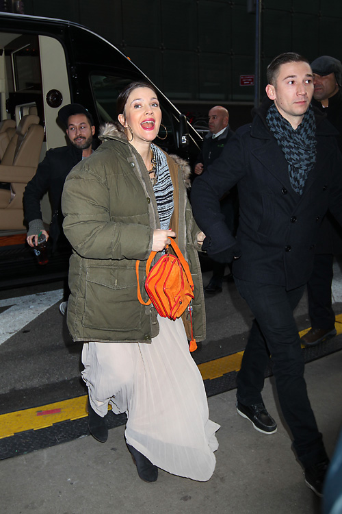 Now, I realize I’m no stranger to snark, but PB readers, I warn you – don’t you DARE judge Drew Barrymore! I realize she looks just slightly crazy in this pic, but she is one of the nicest, kindest, most charming celebs on the planet. I’ve been a hardcore fan of hers since I was 12, and I will defend her to the death! Don’t like her blousy skirt? Parka jacket? Stripey sweater? I won’t hear a word of it.