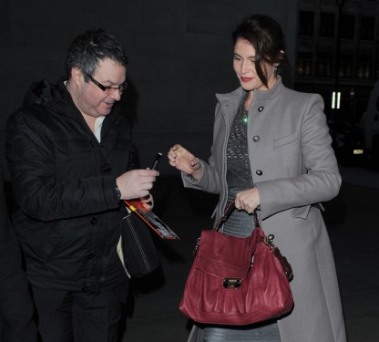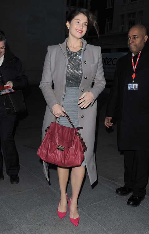 Here’s the woman who, in my husband’s estimation, is the sexiest British actress alive today, no contest. I don’t think I feel quite as strongly about Gemma Arterton as he does, but I do tend to agree with the general sentiment. This is the Hansel & Gretel: Witch Hunters star signing a few autographs as she arrives at BBC Radio 1 Studios in London. On her arm is a chic, rosy pink Nina Ricci Liane Satchel. You can snag this bag in black for $1650 at Forward by Elyse Walker.