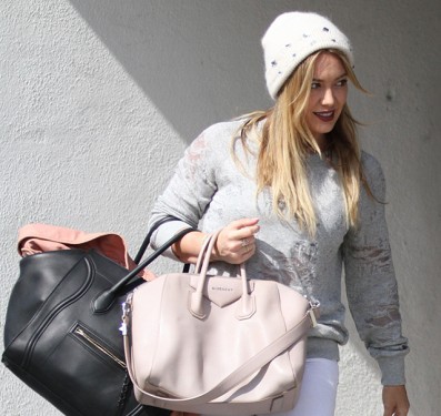 Here’s Hilary Duff, leaving the gym in West Hollywood (in a pair of heels, no less!), clearly showered, blow-dried and ready to take on her post-workout day. She’s carrying both a Celine Luggage Tote and a Givenchy Antigona Bag – one bag for pre-gym, one bag for post-gym, I suppose? Celine bags aren’t sold online, but you can pick up a pale grey Givenchy Antigona similar to Hilary’s for $2,435 at Barneys.