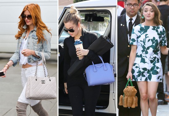 Game of Thrones star Maisie Williams is also 17, just like Bella Thorne, but I feel like she’s having a lot more fun with it. Here she is, heading into an appearance on Jimmy Kimmel Live in a head-to-toe Kate Spade outfit, complete with an amazing, figural wicker frog bag.