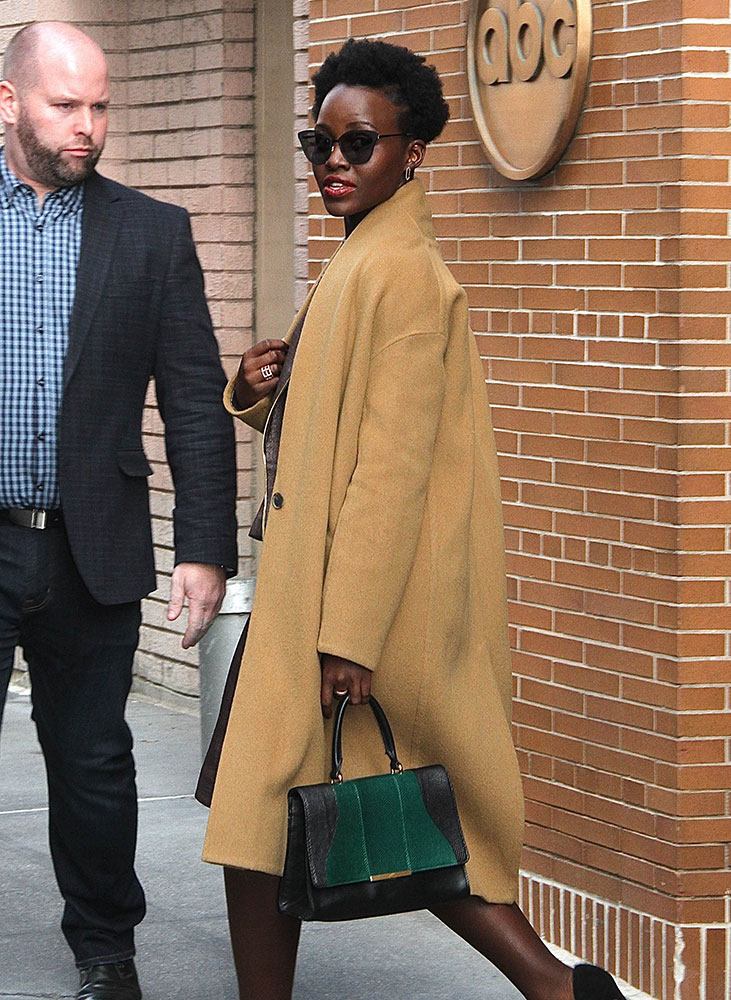 At last, here’s Lupita Nyong’o, leaving The View with a gorgeous green and black mystery bag. Any ideas?