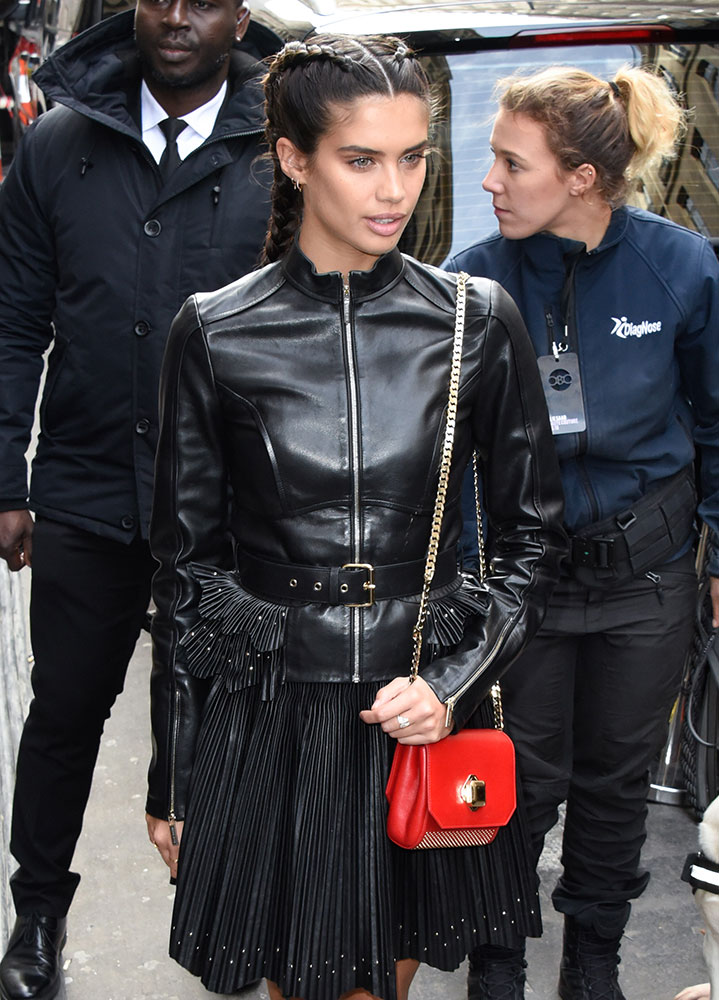 Instead of walking Elie Saab’s catwalk, model Sara Sampaio sat front row with an Elie Saab bag by her side.