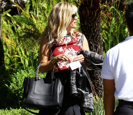 Here’s Reese Witherspoon, performing random acts of Reese Witherspoon-ness in LA, all while carrying a Bulgari Serpenti Tote. (The name of the bag won’t make any sense unless you look closely at those enameled palladium snake handles and that sneaky little snake-head zip pull.) You can currently find Reese’s exact bag in beautiful black nappa leather for $3,250 at Bulgari.