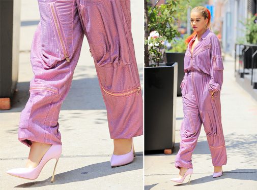 Rita is especially fond of her Casadei Blade Pumps. They go with literally anything, including this baggy pink jumpsuit. I wanted to find out which designer was responsible for this magical creation, but if you google “Rita Ora jumpsuit,” the results are actually pretty overwhelming.