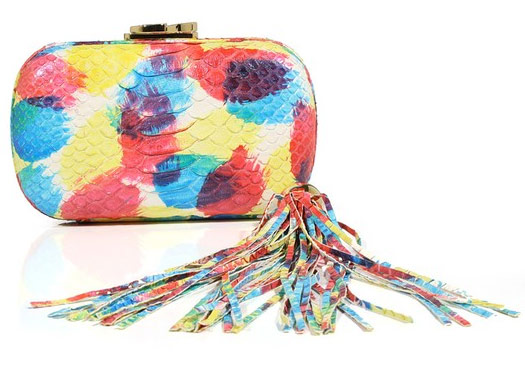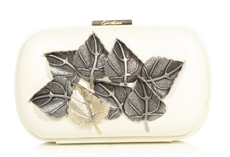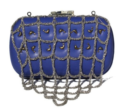 I took the liberty of using the spider clutch as a feature because Halloween is quickly approaching and it’s my favorite holiday, but the motifs you’ll find in this collection are as varied as a summer day is long. From a pale, modernist American flag to sunny painted python to sober forged metal leaves, relative newcomer Moltedo offers a little something for everyone. Everyone who likes a crazy clutch, that is.