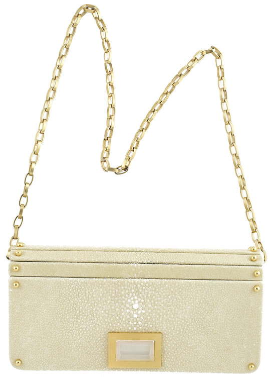 I found it shocking that some of you were not drooling with me over my introduction of Kara Ross handbags. Sure, her bags are funky and colorful, but they are so appealing and perfect for you to go daring when wearing your clutches. The spring it is all about bright and bold colors, which is precisely what Kara Ross does best. But since I already covered many of the bright bags, it is time for me to cover a more neutral bag from this very talented designer. Kara Ross focuses on exotic skins and semi-precious stones and has implemented beige stingray with a white quartz in the Kara Ross Verus Stingray Clutch. This clutch is able to be worn every season, for many years to come, as it is the perfect wearable neutral. While I agree your handbag should say something about you, it is evening bags that really catch my attention. An evening bag can dress up and change an outfit in a snap, and this clutch will deliver. There is gold hardware and a chain strap. The Verus Clutch will be available later this month in Neiman Marcus stores and you can check for more information at Kara Ross online. The price is $2,850.