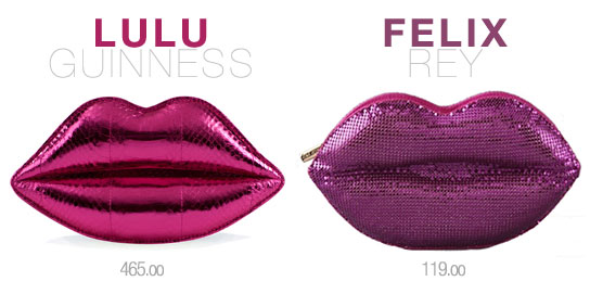Felix Rey is constantly providing accessory lovers with funky products and right when I saw the Felix Rey Kissy Face Mesh Clutch, I immediately thought of the infamous Lulu Guiness Lips Clutch. The dimensions of both are very similar as is the look of both items. For hundreds less you can nab the lips clutch style, but if you ask me, I’d go for one of the original Lulu Guiness versions, of which there are plenty. Shop the Lulu Guiness Lips clutch for $465 via Lulu Guiness online and buy the Felix Rey option for $119 via ShopBop.
