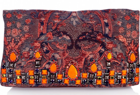 In a normal season, that can make Williamson’s bags a bit intimidating to customers, but patterned and embellished accessories are such a strong fall trend that the brand’s clutches have never felt more relevant. The Matthew Williamson Brocade and Suede Clutch is my personal favorite of the season – the orange colorway is particularly gorgeous because the orange stones pick up the warm undertones in the upper part of the clutch. The whole thing could combust at any moment.