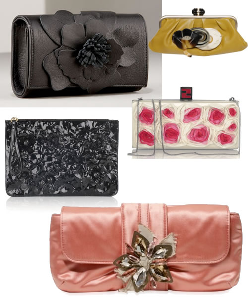 The Fendi Floral Box Clutch or Lanvin Satin Crystal Flower Oulala Clutch would pair perfectly with a flouncy summer dress for a summer wedding. The Fendi Fendi Floral box clutch is the ultimate and most luxe of the floral clutches. It features actual hand stitched and painted cabbage rose style flowers sewn directly onto a box clutch. The Carlos Falchi Floral Box clutch’s large leather floral appliqué adds a whimsical downtown edge to this tone-on-tone mini sized clutch. The Valentino black patent Primavere clutch works well with dark daytime tailored suits or for evenings your favorite LBD. Marni’s goatskin clutch contrasts a soft leather with the hard badge-like flower cut outs. A sweet little clutch perfect for adding a dose of color under your arm.