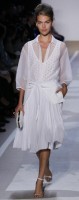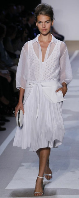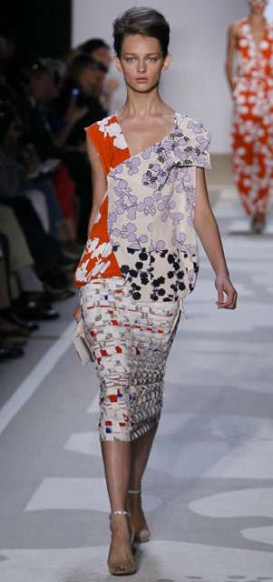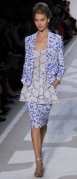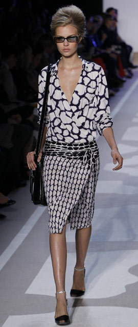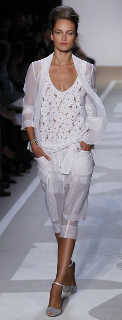 Even though the notes for Diane von Furstenberg’s Spring 2012 runway show at Mercedes-Benz Fashion Week New York indicated that the inimitable DVF had been inspired by modern Africa, the clothes that can down the runway felt a lot more like early-1960s California to me. Between the soft color palette (the show opened with white, a first for von Furstenberg), the midcentury modern floral prints and the models with beehive hairdos, I could have sworn we were all in Palm Springs.