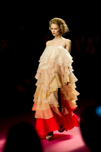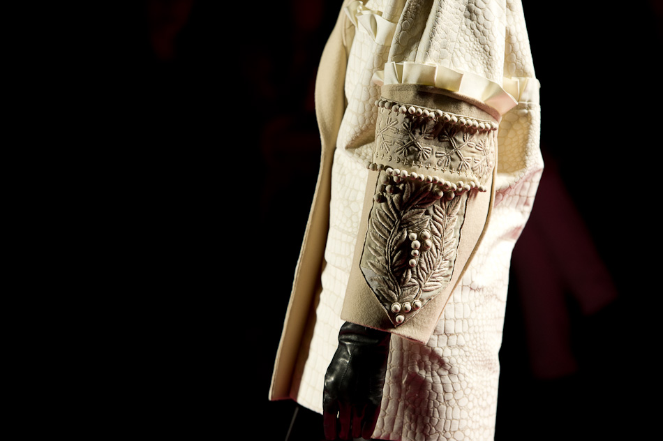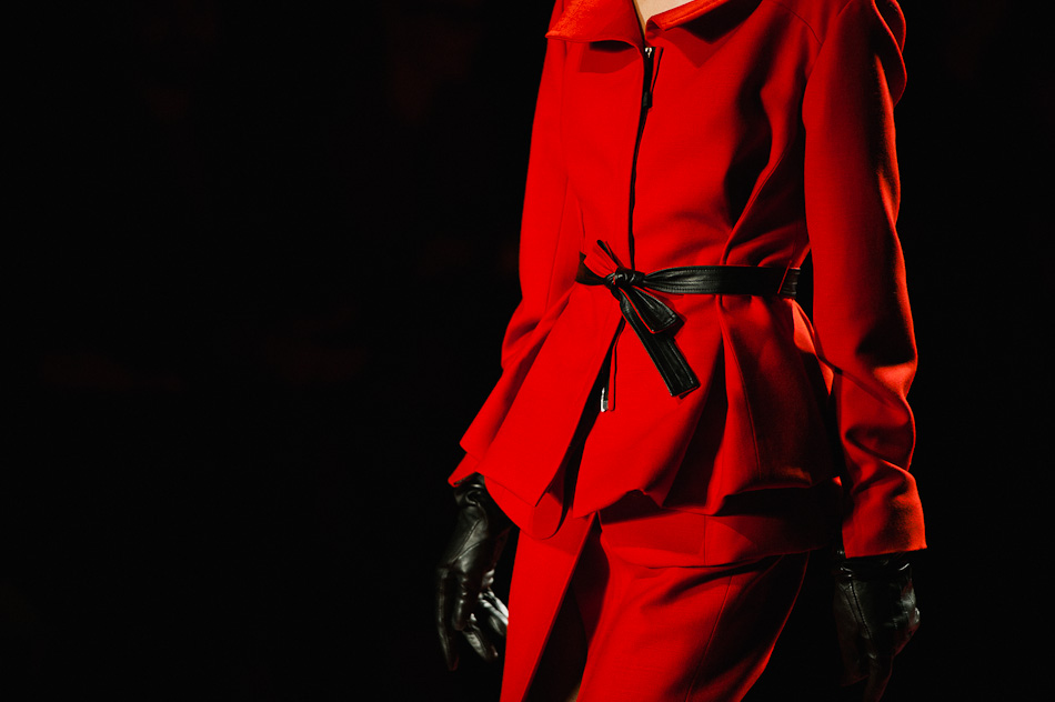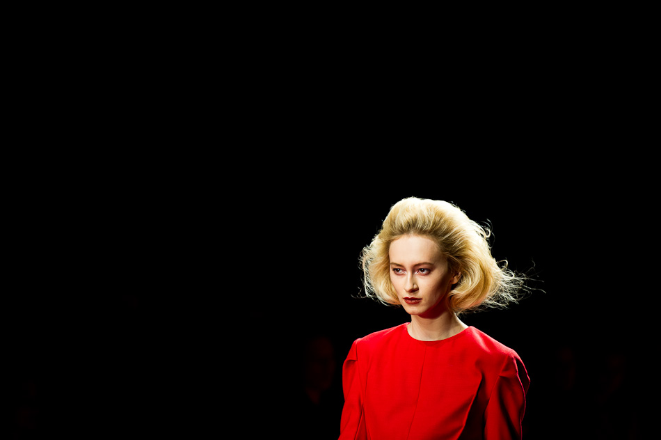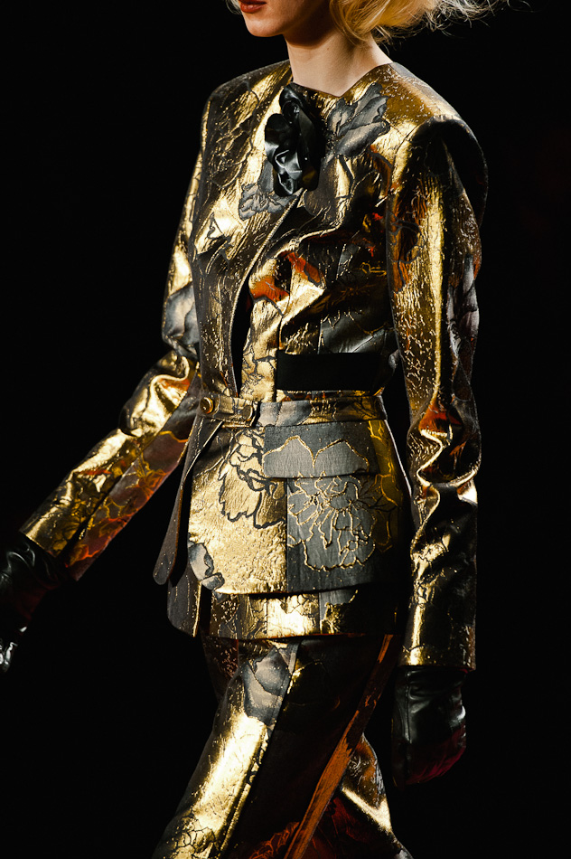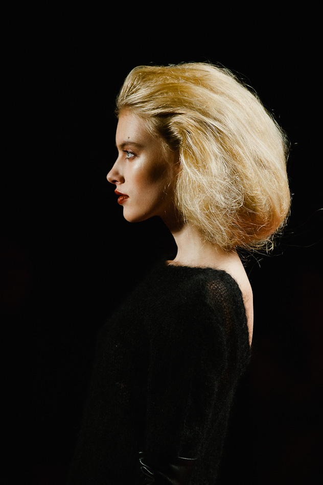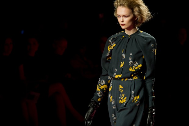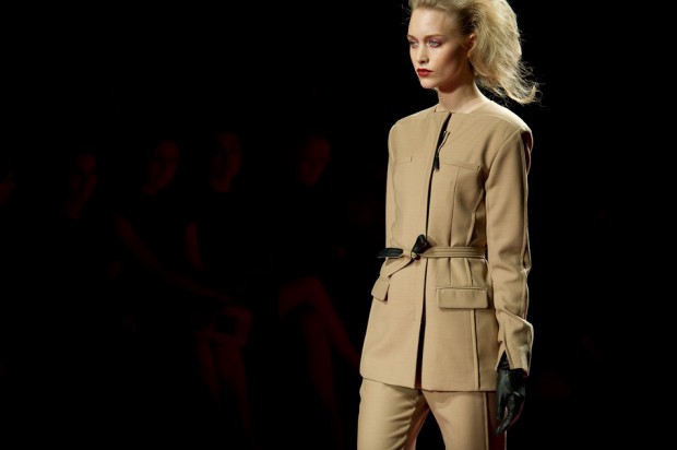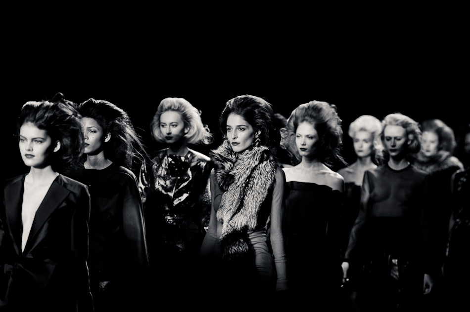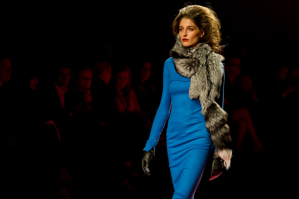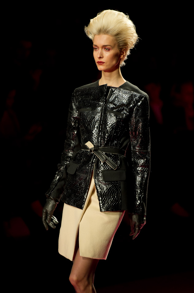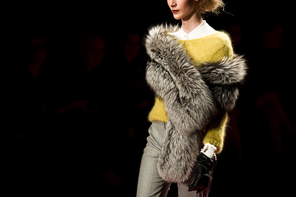 Bell described his fall ideal as, “A perfect woman in an imperfect situation. Her look is polished, rich and refined, but she herself is dangerous.” And indeed, the phrase that came to mind when viewing the line of impossibly luxurious knits, furs and highly detailed coats (all topped with what was once a careful, elegant hair style come halfway undone) was “deranged Upper East Side doyenne.” Check out our gallery of the utterly luxurious collection after the jump.