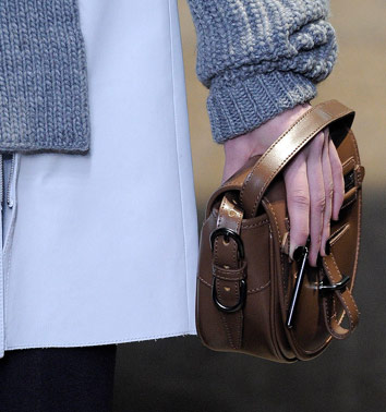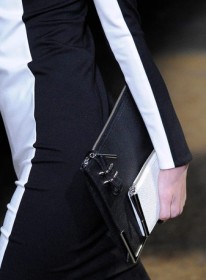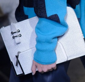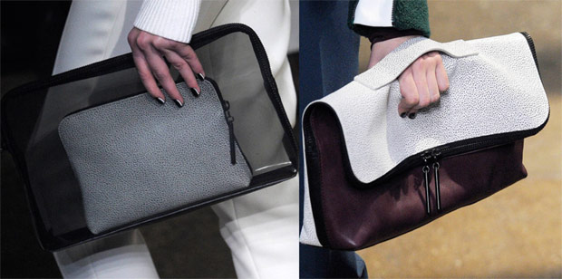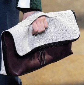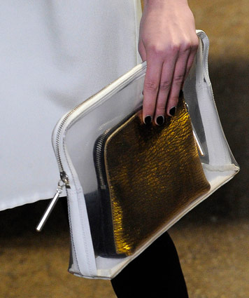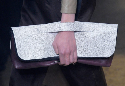 In a season where several major American accessories designers have opted to go with straight-up whimsy and humor, 3.1 Phillip Lim Fall 2012 took a much more intellectual approach. Building on the widespread critical success of his 31 Hour, Minute and Second bags from Spring 2012, fall’s runway collection marked a continued exploration of handbag structure and the ways that modern women interact with their accessories. Most of the larger clutches revealed small cosmetic bags inside, and the portfolio bags sported smaller exterior attached pouches.