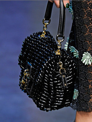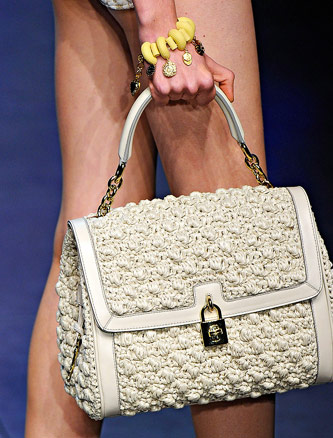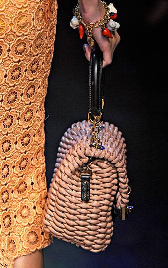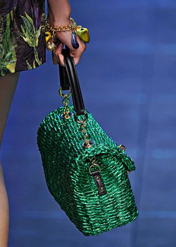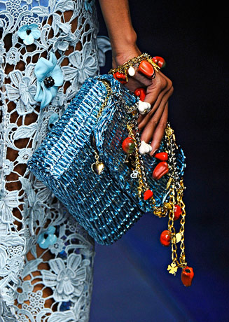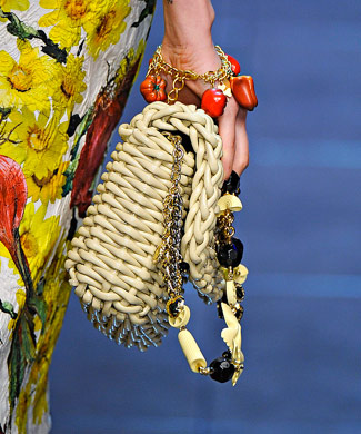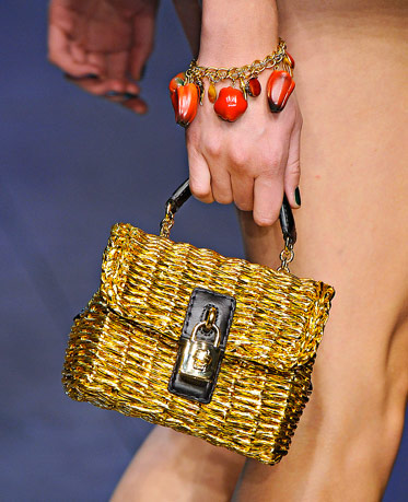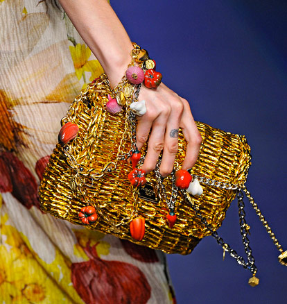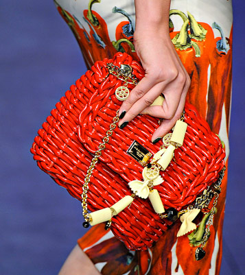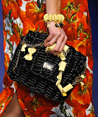 As I flipped through the images of Dolce & Gabbana Spring 2012, one song played in my head: “Be Italian,” from that movie Nine that no one saw last year. The film may not have been a masterpiece, but the spirit of its most famous musical number couldn’t have been any more dead-on for Dolce’s spring collection. From bracelets decked in miniature red peppers to handbag straps dangling with faux dried pasta, I’m suddenly jonesing for a big plate of fettucini bolognese.