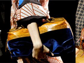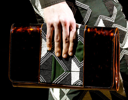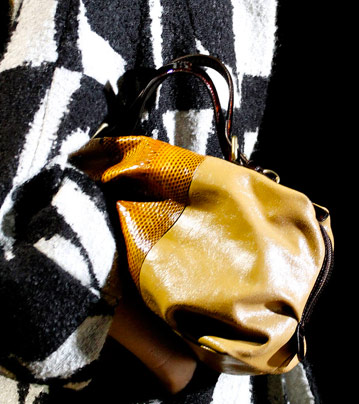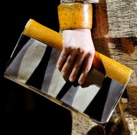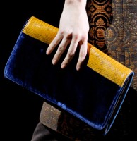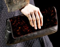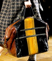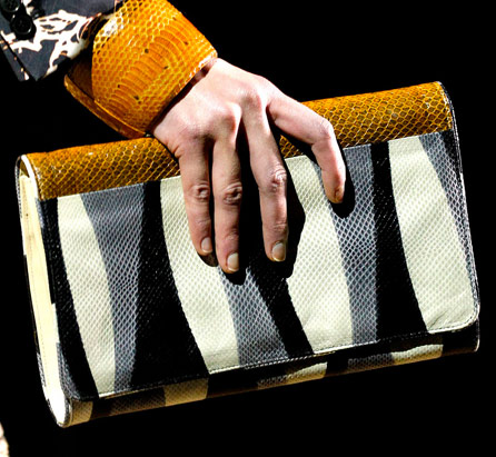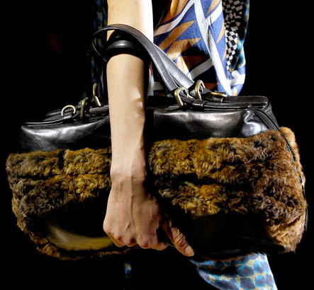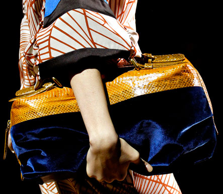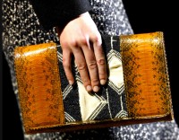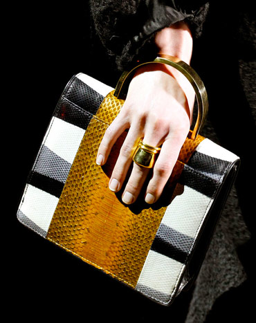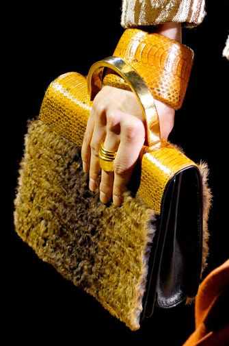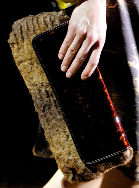 If Spring 2011 is all about layers and combinations of bright colors, then Fall 2011 is shaping up to be all about layers and combinations of strong textures. Python, velvet, fur, tweed, wool, sequins, leather – the more materials you can pile on to an outfit, the better, and Dries Van Noten Fall 2011 will help you do that via your handbag.