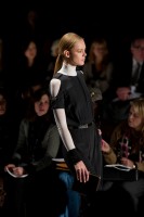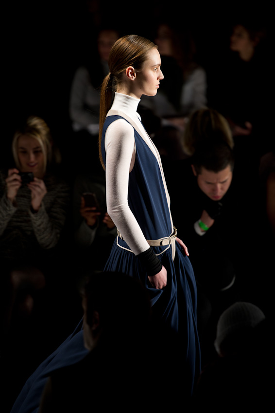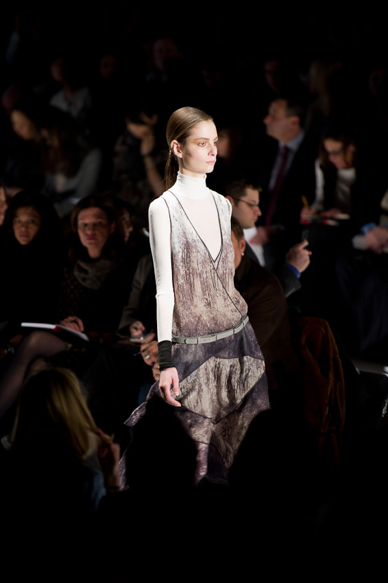 The dresses were both easy and feminine. The collection stuck to layers, showing almost every look with tissue thin white turtlenecks underneath. From the dresses we saw long flowy bottoms with plunging back and necklines. When color was added it was in clolorblocking and abstract geometric prints.