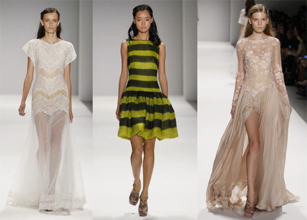 As I sat watching the looks from Tadashi Shoji Spring 2012 waft by (and they definitely wafted, just look at them), I couldn’t get the phrase “garden wedding” out of my head. Shoji’s collection isn’t bridal, it’s ready-to-wear, but I can’t help but think that there are wonderful spring wedding frocks in this set of dresses for everyone from brides to bridesmaids to guests.