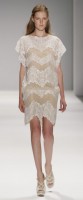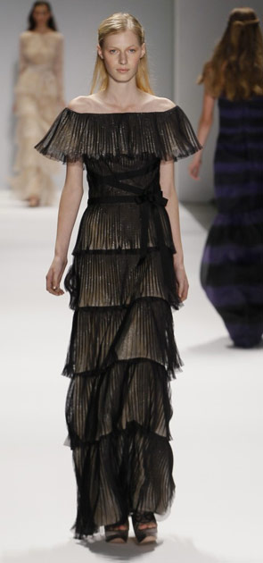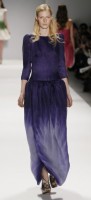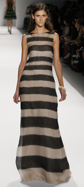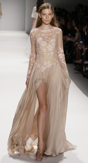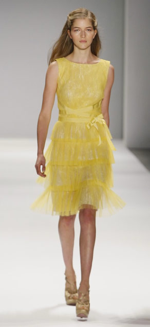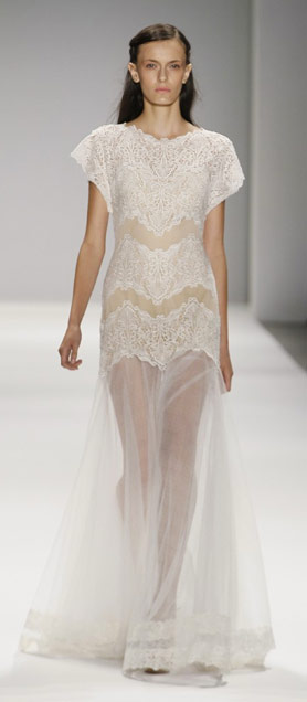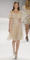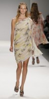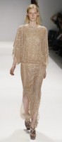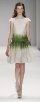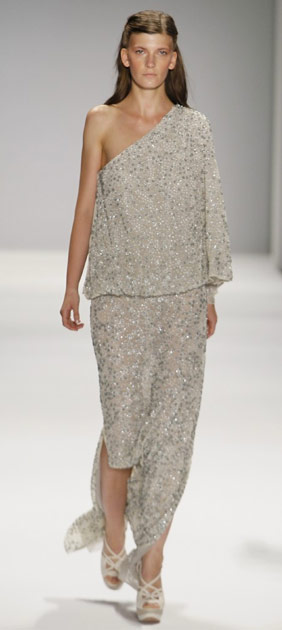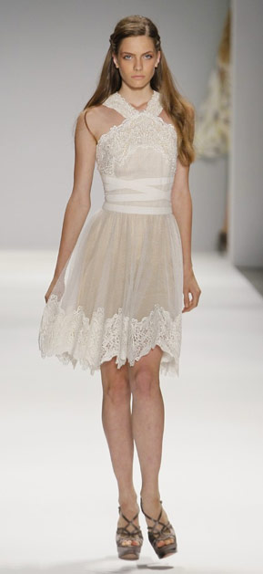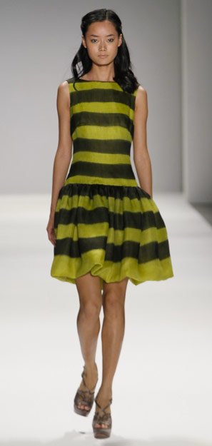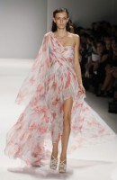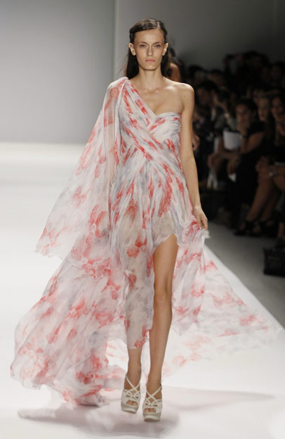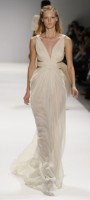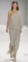 I doubt that Shoji would balk at the suggestion, because he surely knew that doing a collection full of floor-length gowns in light neutrals and cocktail-length dresses in spring brights and prints would call to mind April nuptials in lush, verdant surroundings. If you know someone who’s getting married next year, take note of this collection. Even more so if you’re a slightly nontraditional bride; the white, nude and pale silver dresses aren’t classic bridal, but they’d be perfect for a modern woman. Highlights, as always, are after the jump.