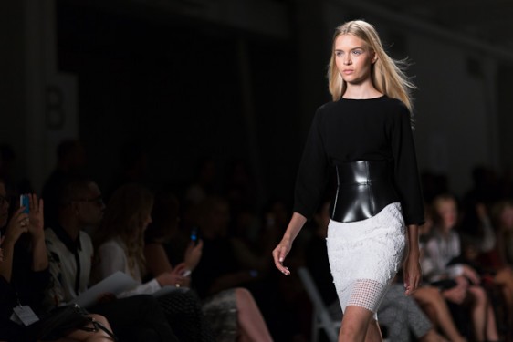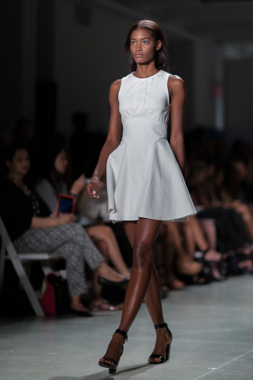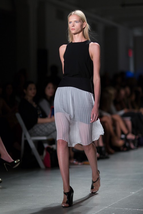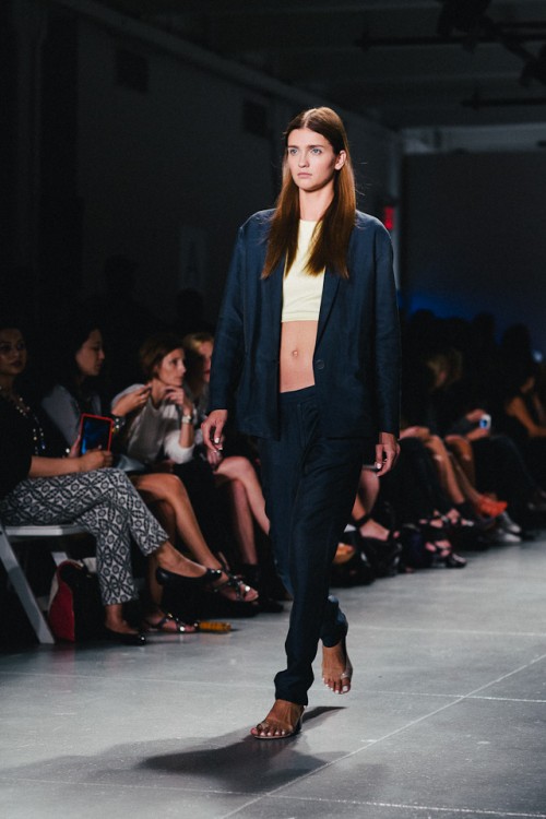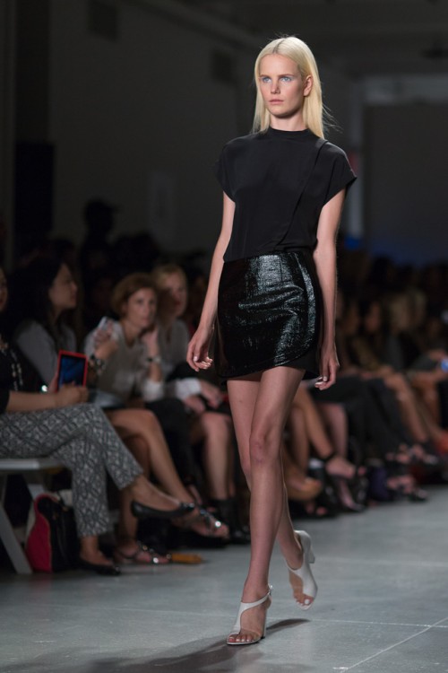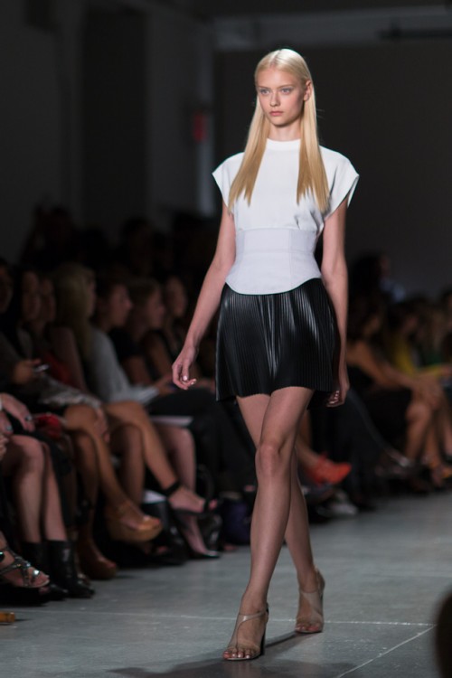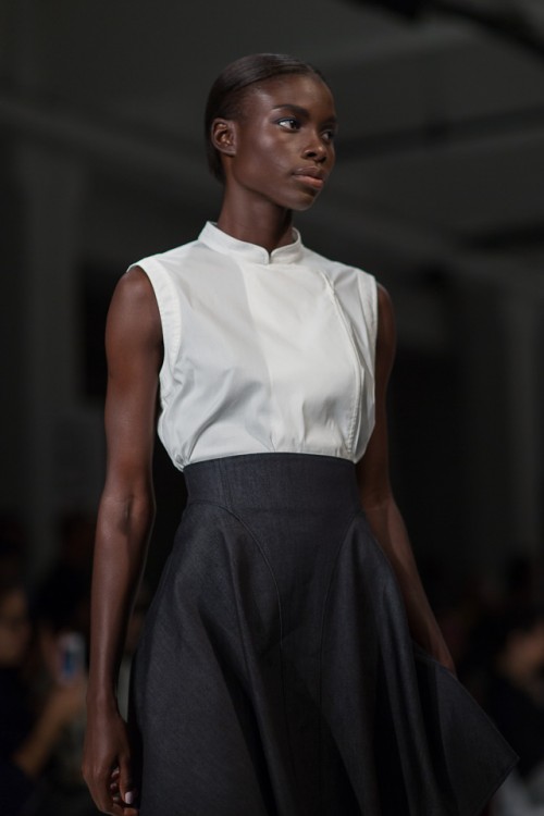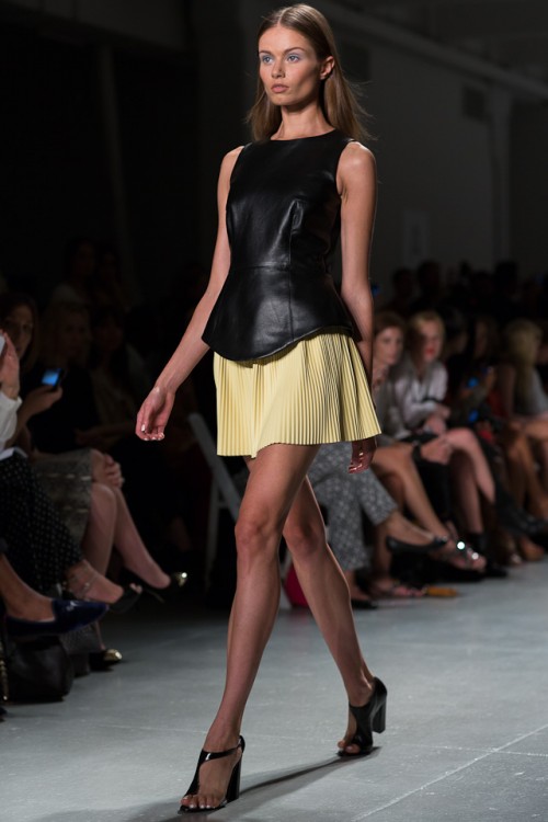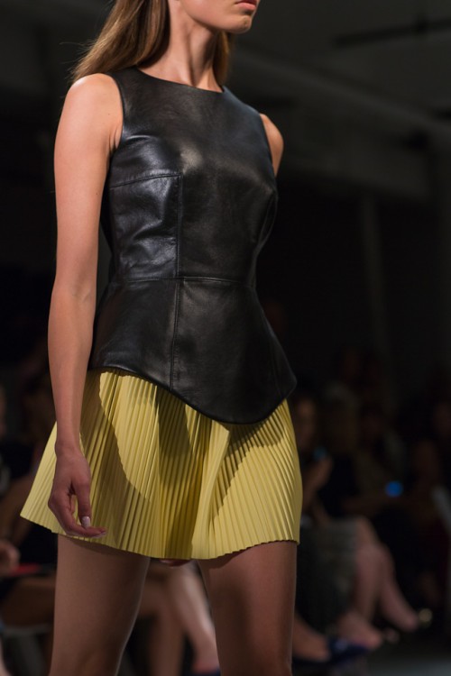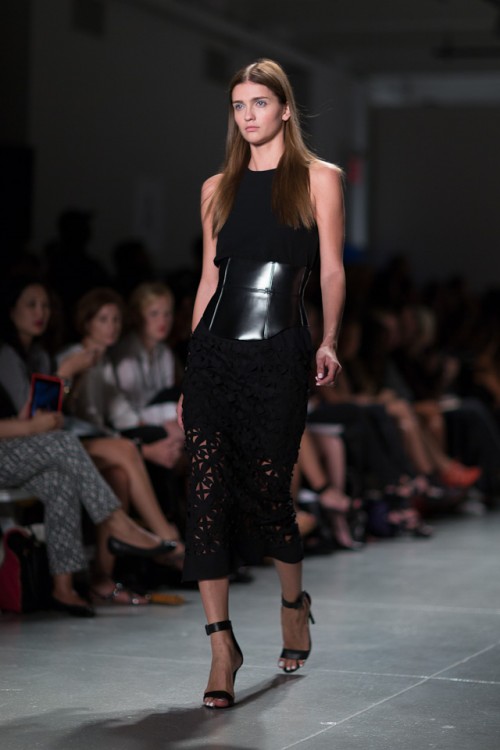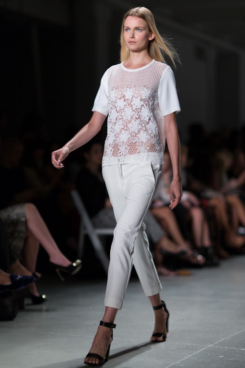 Last season the Tibi show was filled with prints, and editors, buyers and bloggers alike showed up at this season’s show wearing Tibi prints. But for Spring 2013, prints were out and solids were in. A chic boyfriend fit defined many of the pants, and similar to some other shows this season, it looks like we should all be doing crunches – cropped tops are in. When it came to skirts and dresses, a fitted bodice gave way to a more flared bottom, with the fitted waist being a notable spring staple.