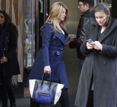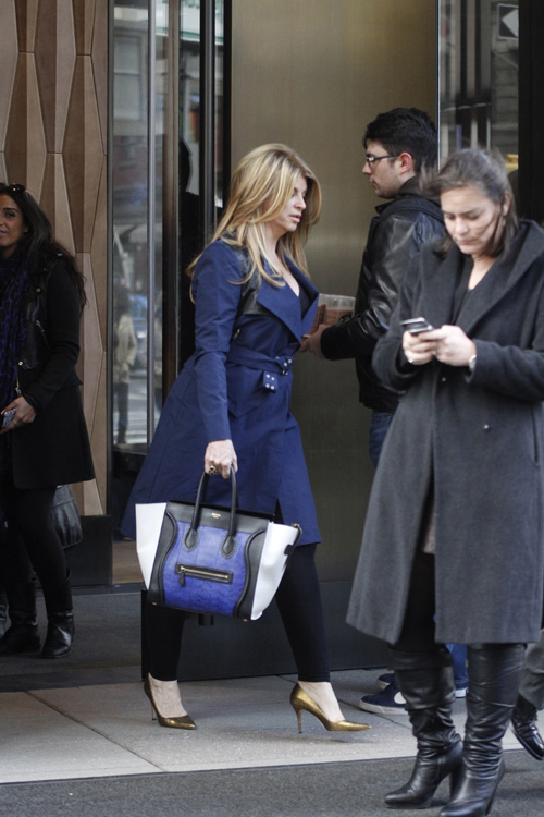 Here’s Kirstie Alley in New York City, matching her cobalt blue trench to her extra chic Celine Luggage Tote. We find this particular tote truly interesting because the front panel is bright blue snakeskin instead of regular leather. The combo of blue snakeskin, black leather, and white gussets make this an especially gorgeous version of the Luggage Tote. Celine Luggage Totes, like all Celine bags, are only available at high end department stores and Celine boutiques. If you’ve got your heart set on this version, though, watch out – it’ll set you back more than the $2,700 that the all-leather tricolor version costs.