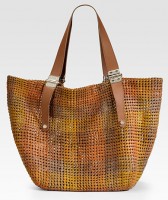 Bottega did leather-as-straw (http://www.purseblog.com/totes/bottega-veneta-woven-tote.html), but it really looked like straw unless you examined it closely. I don’t think Choo’s intention was to imitate with this design, but rather to offer an alternative that felt just as summery. I could be wrong, but if they were trying to make this tote in the image of that Bottega bag, they have a long way to go.