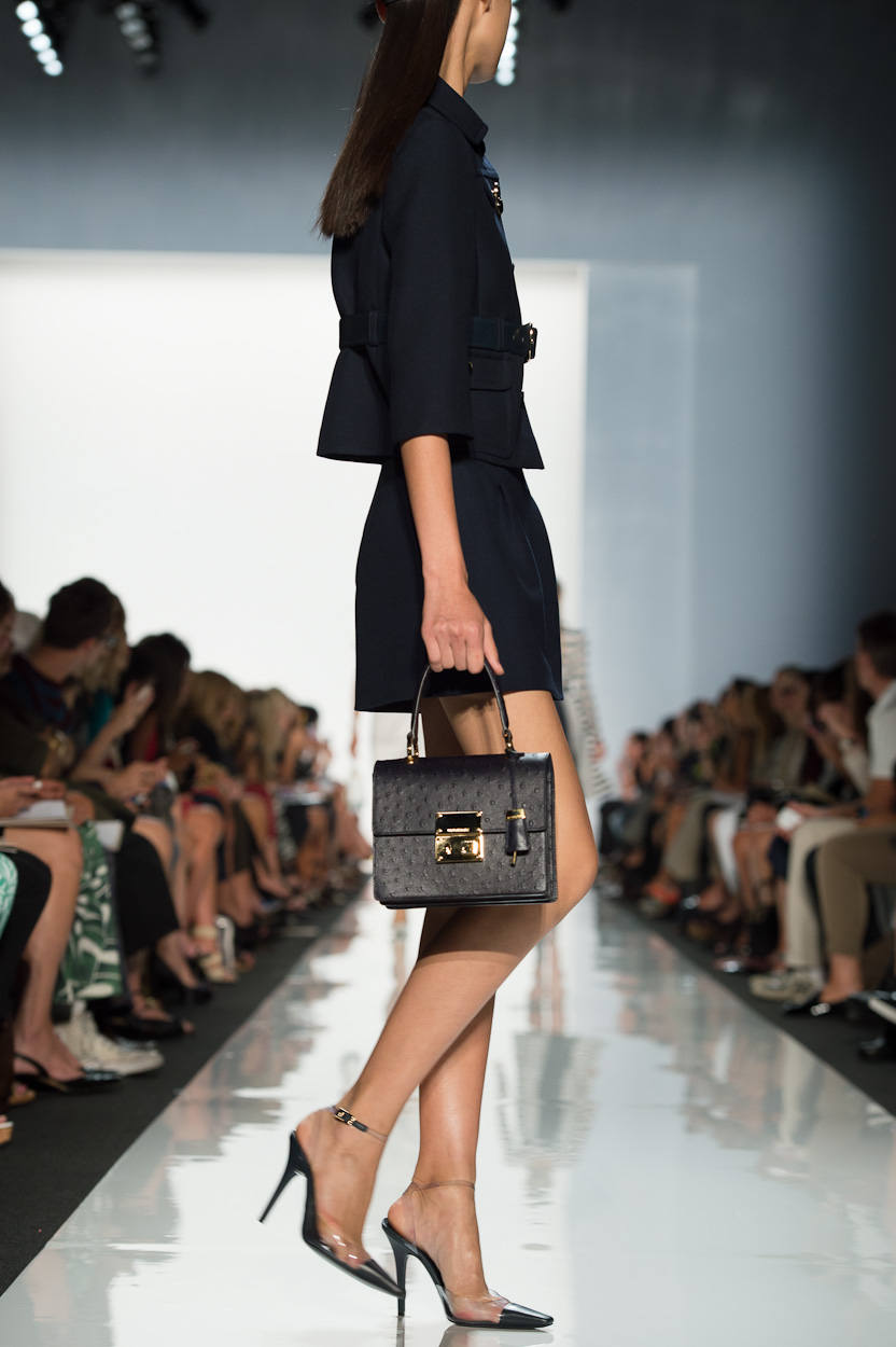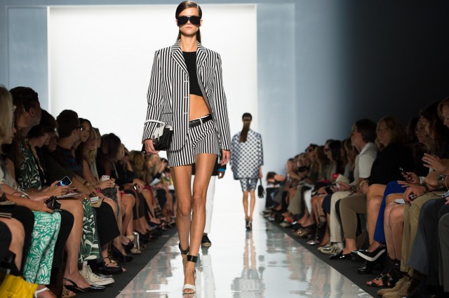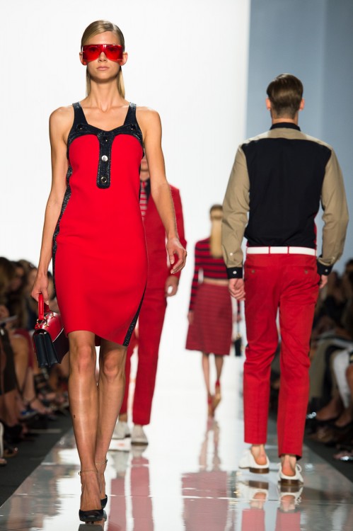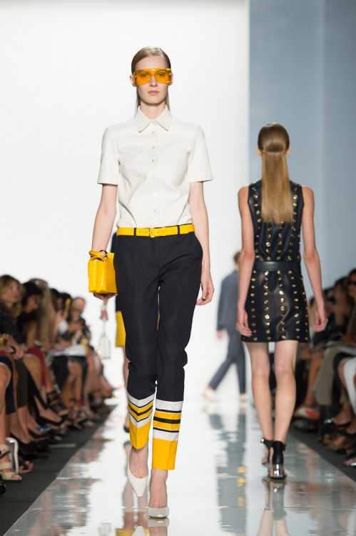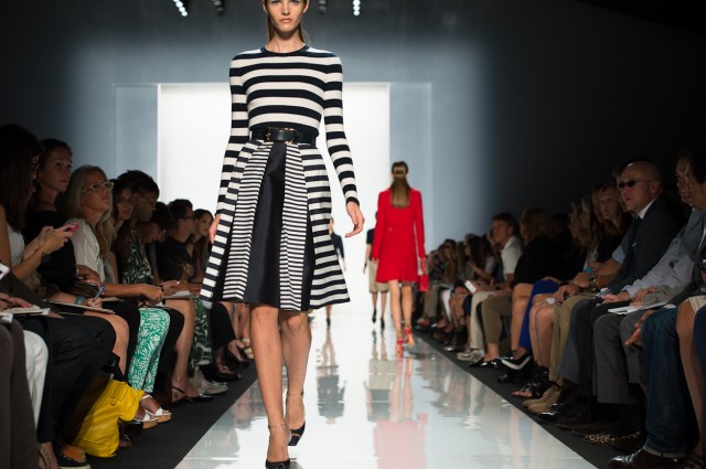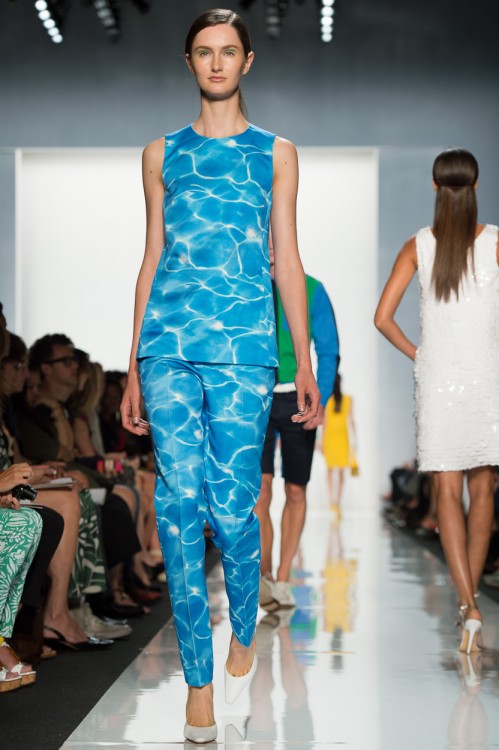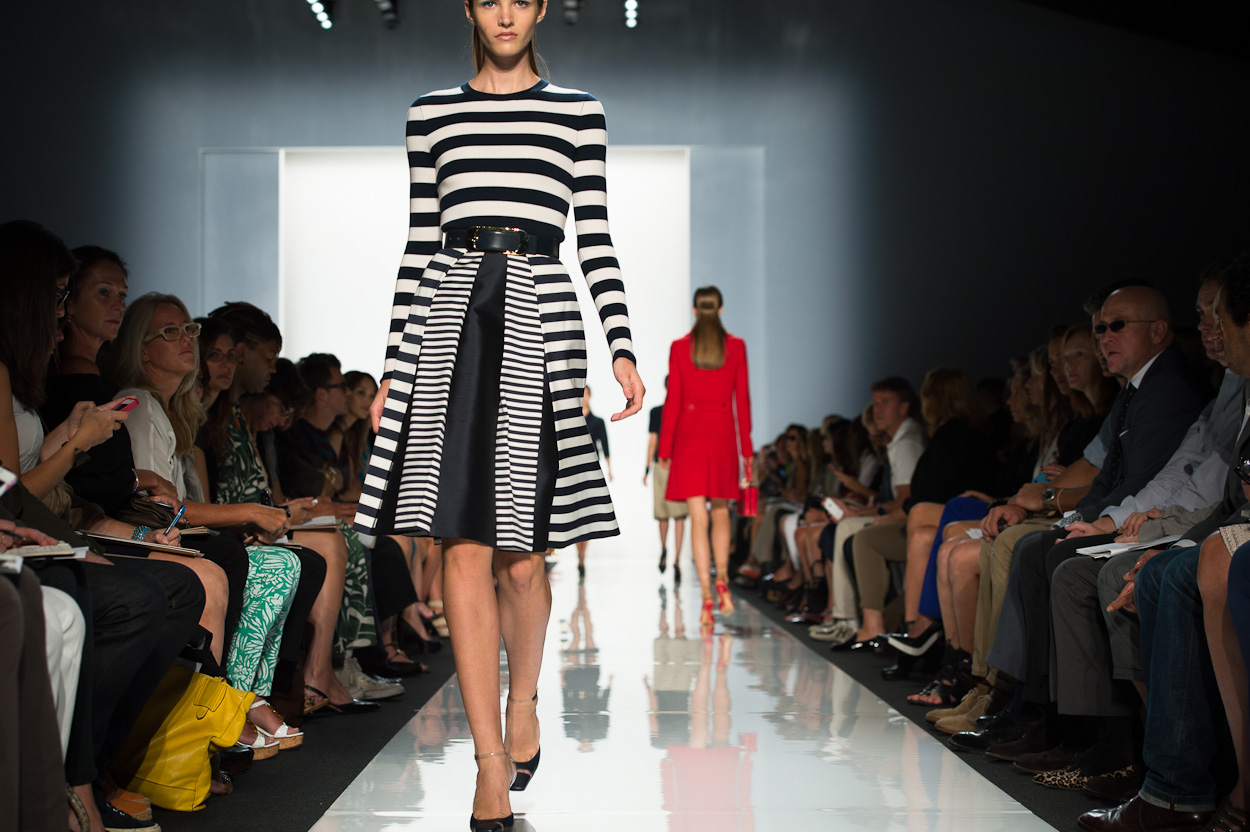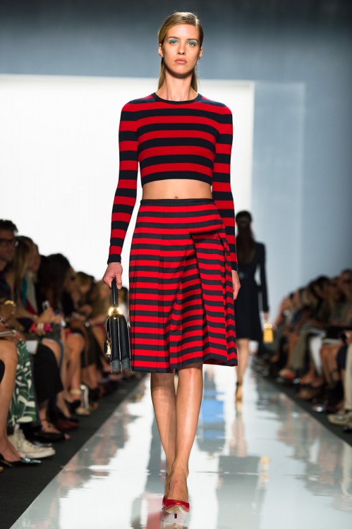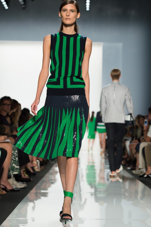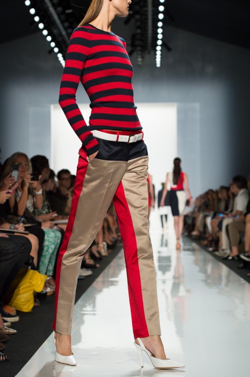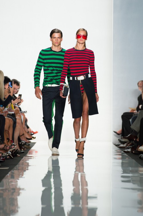 Michael Kors is as traditional and classic a purveyor of American sportswear as you’ll ever find, so when even he is exploring modernism, you know it’s genuinely where the industry is headed. Kors is world-famous for his timeless, wearable separates and sleek evening dresses, and sleek is in fact a perfect word to describe Michael Kors Spring 2013. From striped knits to ensembles covered with digital prints of clouds and pools, the trim shapes in bold, preppy colors were clearly looking forward.