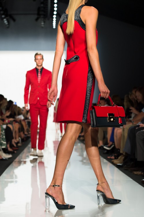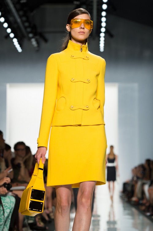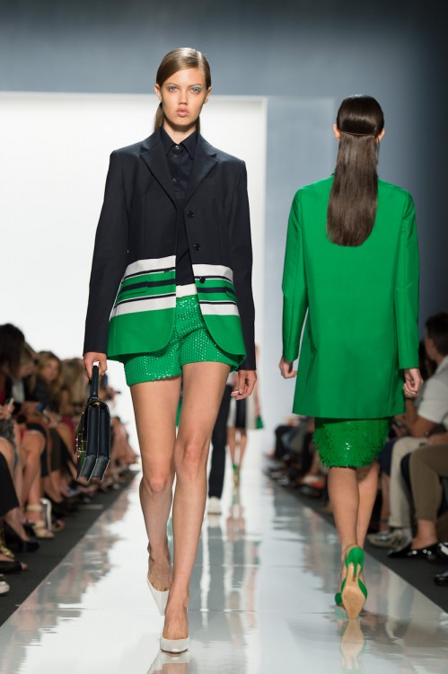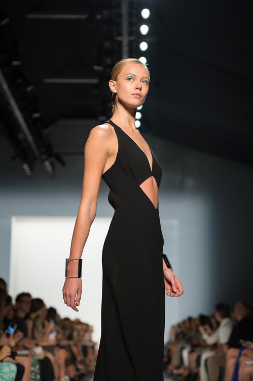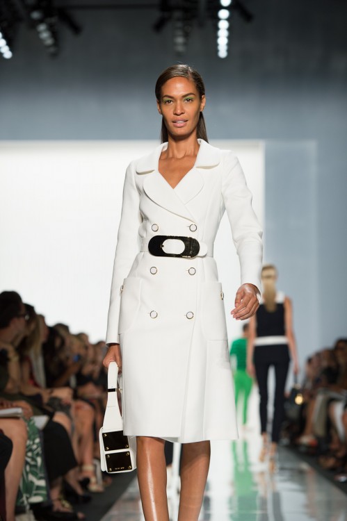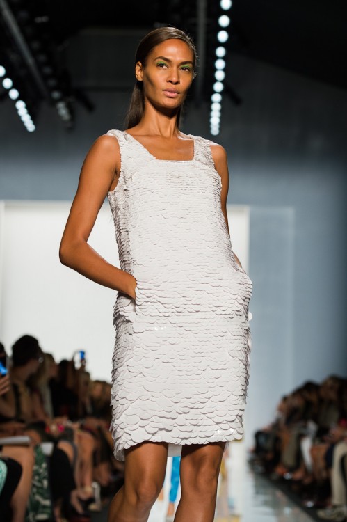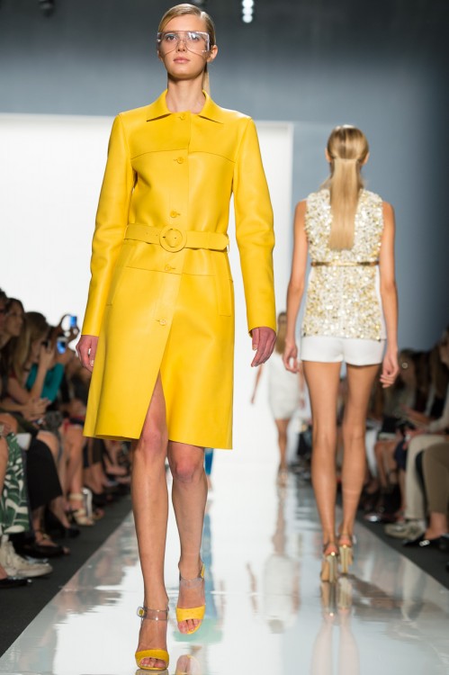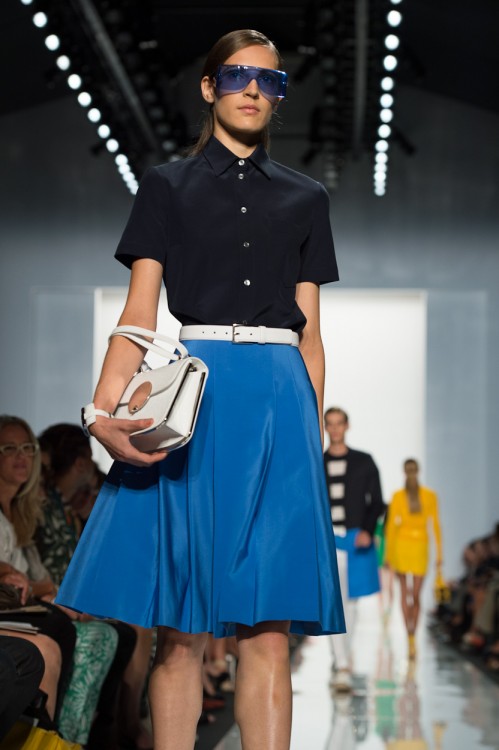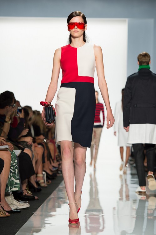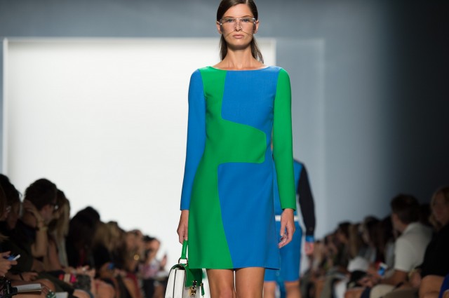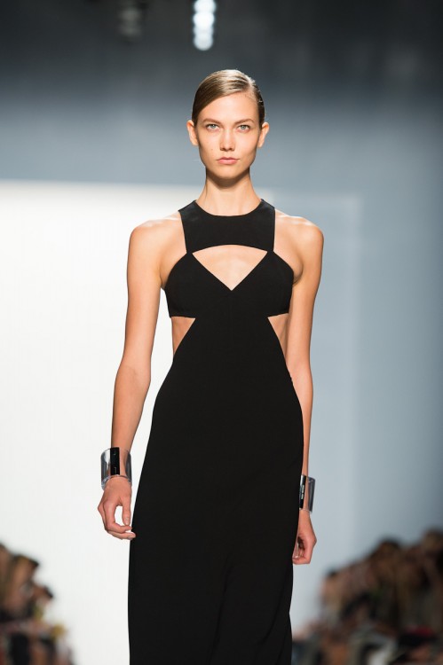 To say that the collection only had the future in mind, though, would be overly simplistic; there was also a heavy dose of 60s graphic idealism in the clothes, particularly in the stark way that colors were juxtaposed against white and black (and sometimes, against each other). In the end, though, it was more modern than mod. One only needs to take a look at Karlie Kloss’s slim black finale dress to know which era won out.