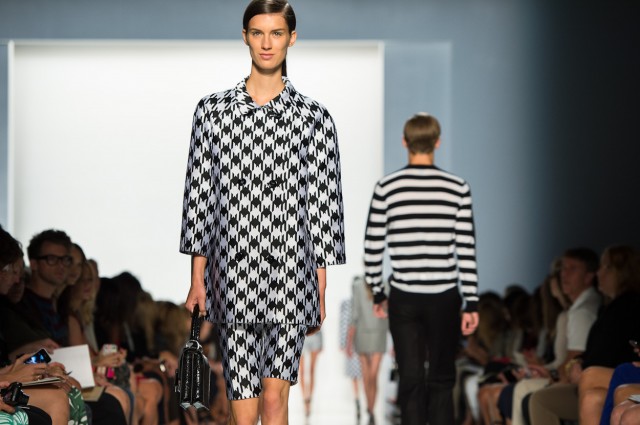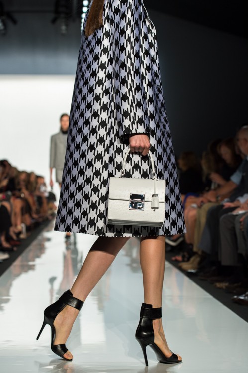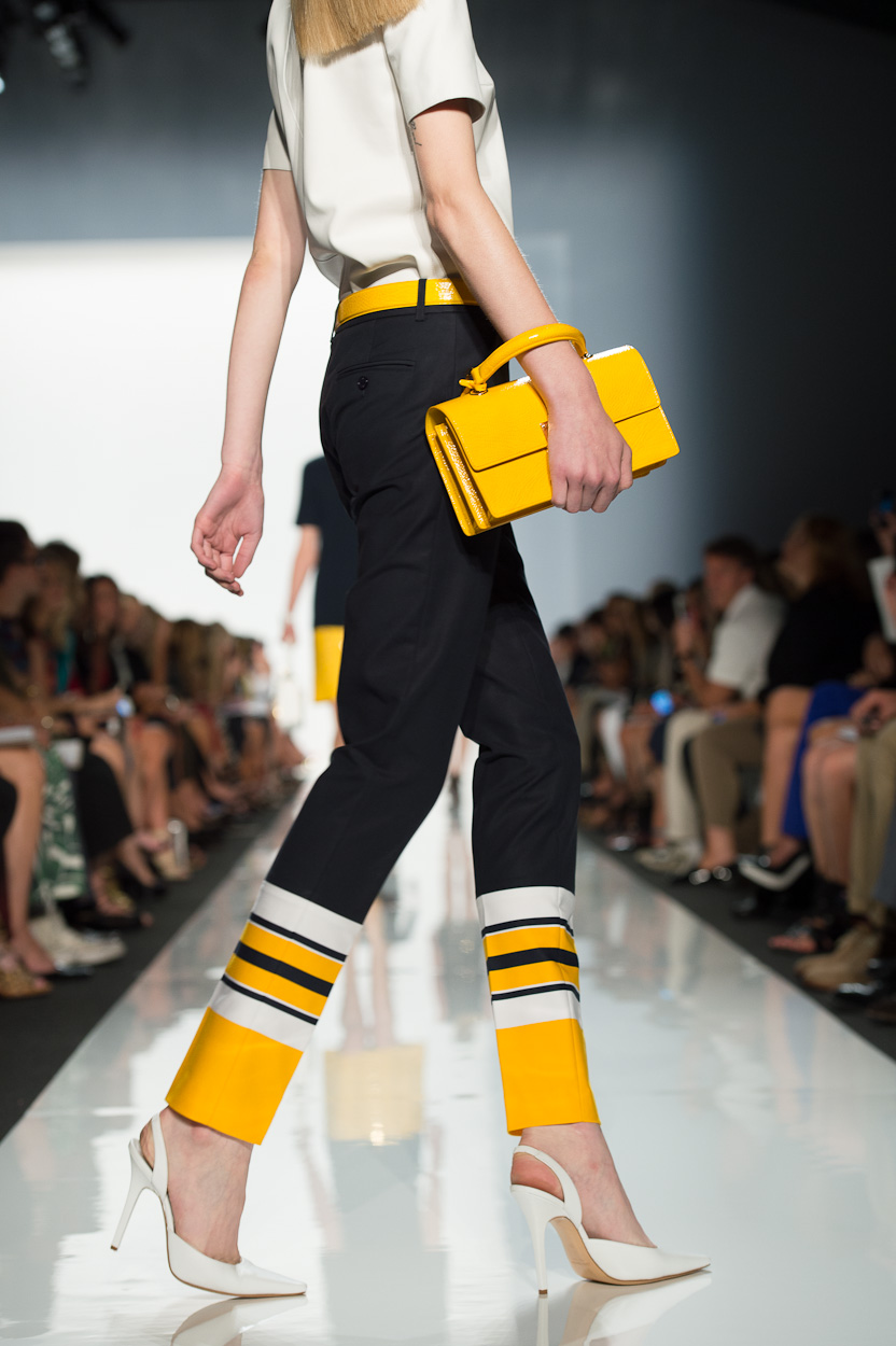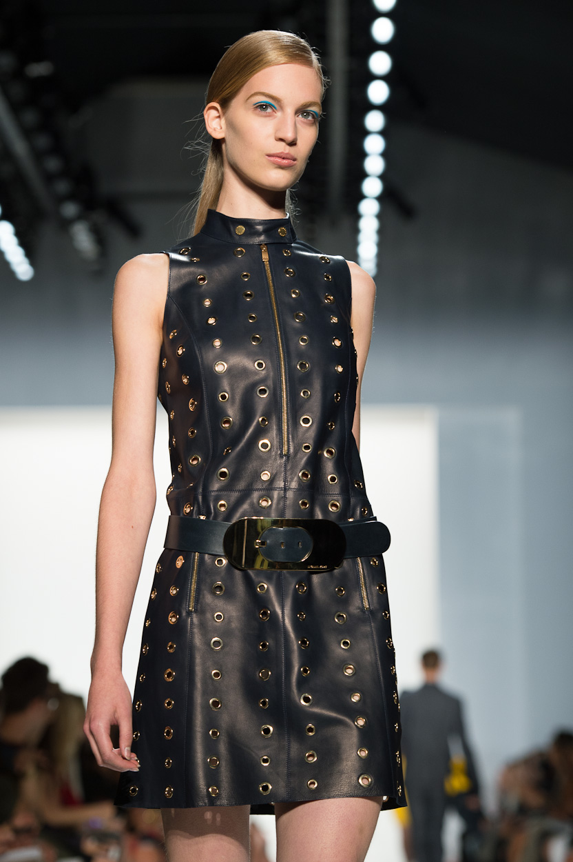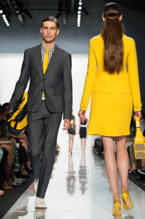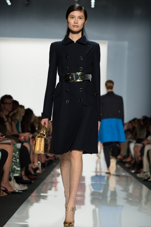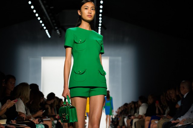 To say that the collection only had the future in mind, though, would be overly simplistic; there was also a heavy dose of 60s graphic idealism in the clothes, particularly in the stark way that colors were juxtaposed against white and black (and sometimes, against each other). In the end, though, it was more modern than mod. One only needs to take a look at Karlie Kloss’s slim black finale dress to know which era won out.