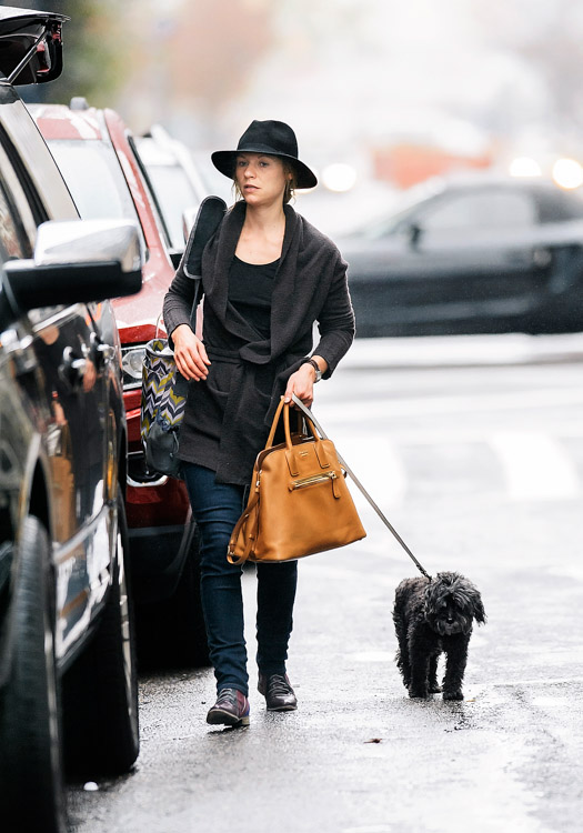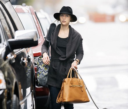 My 90s heroine Claire Danes was recently spotted walking her adorable dog WeeGee in Soho, NYC with a Prada Saffiano Cuir Open Promenade Bag and a diaper bag of unknown origin. Her hat seems totally appropriate for the utterly dreary weather we experienced in NYC this weekend; unfortunately it didn’t help disguise her from the paps at all. Claire is a long-time Prada loyalist, she’s been wearing/carrying Prada for as long as I’ve been reading glossy fashion mags. You can pick up Claire’s luxe leather tote for $2,390 at Neiman Marcus.