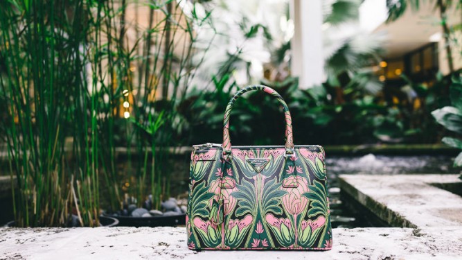 We took this bag out and around Miami, which was the ideal backdrop for the pink and green tulip pattern. The deep green along with light green will look nice in the warm spring and summer light, and the pink popping through gives an extra layer of visual interest. If your spring plans take you somewhere warm, this bag is extraordinary.