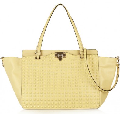 Season after season, without fail, Valentino has adorned leather bags great and small with the tiny silver pyramids known affectionately as Rockstuds. Sometimes they’re just an accent, sometimes they take up the whole bag, but they’re always there, and until recently, they were always the same. For fall, Valentino Noir introduced us to a darker side of the girlish look, and now spring brings with it the exact opposite – lemony enamel studs on matching pastel leather.